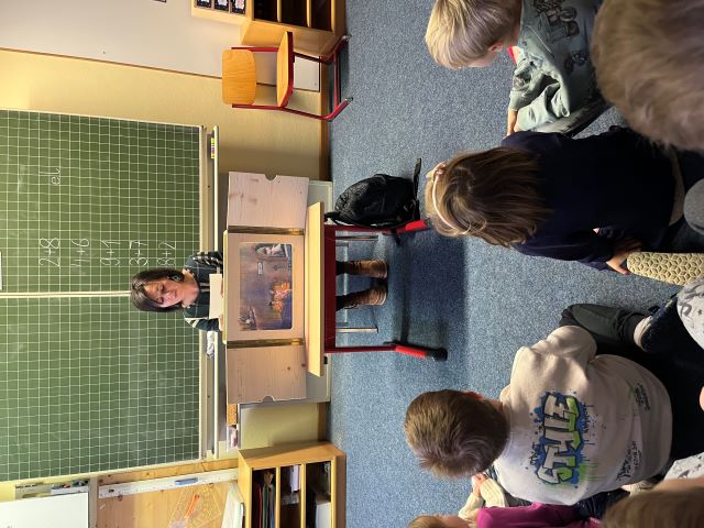Die Kombiklasse 1/2 durfte sich über eine Vorlesestunde mit Frau Schiessleder freuen. Mit viel Ausdruckskraft brachte sie die warmherzige Geschichte „Das Katzenhuhn“ zum Leben – eine Erzählung über Mut, Verschiedenheit und Freundschaft.